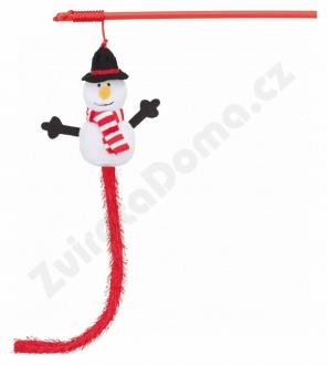 Vánoční hračka na udici pro kočky. Plyšová hračka s motivem sněhuláka je připevněná na udici. Hračky pro kočky na udici jsou velmi oblíbené a v kočkách evokují radost z honění se.