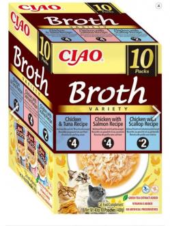 CIAO BROTH Multipack obsahuje 10 kapsiček natrhaného kuřecího masa v lahodném kuřecím vývaru. Vyrobeno ze 100% čistého kuřecího prsa. Žádné obiloviny, konzervanty ani umělá barviva. Vysoký obsah vody, který je prospěšný pro celkové zdraví koček. Nízký obsah kalorií.