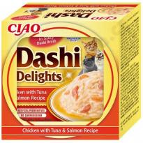 Dashi kapsičky obsahují lahodný vývar, který je vyrobený z bonito vloček ze sušeného tuňáka uloveného ve volné přírodě a je smíchaný s kuřecími kousky pro zvýšení obsahu bílkovin. Jsou skvělé doplňkové krmivo s vysokým obsahem vody - zpestřete stravu vašim kočičích kamarádům kapsičkou s až 93% vlhkostí. Jednoduše lahodné - čerstvé ingredience s přidaným vitamínem E pro podporu jejich imunitního systému a extraktem ze zeleného čaje jako přírodního antioxidantu.